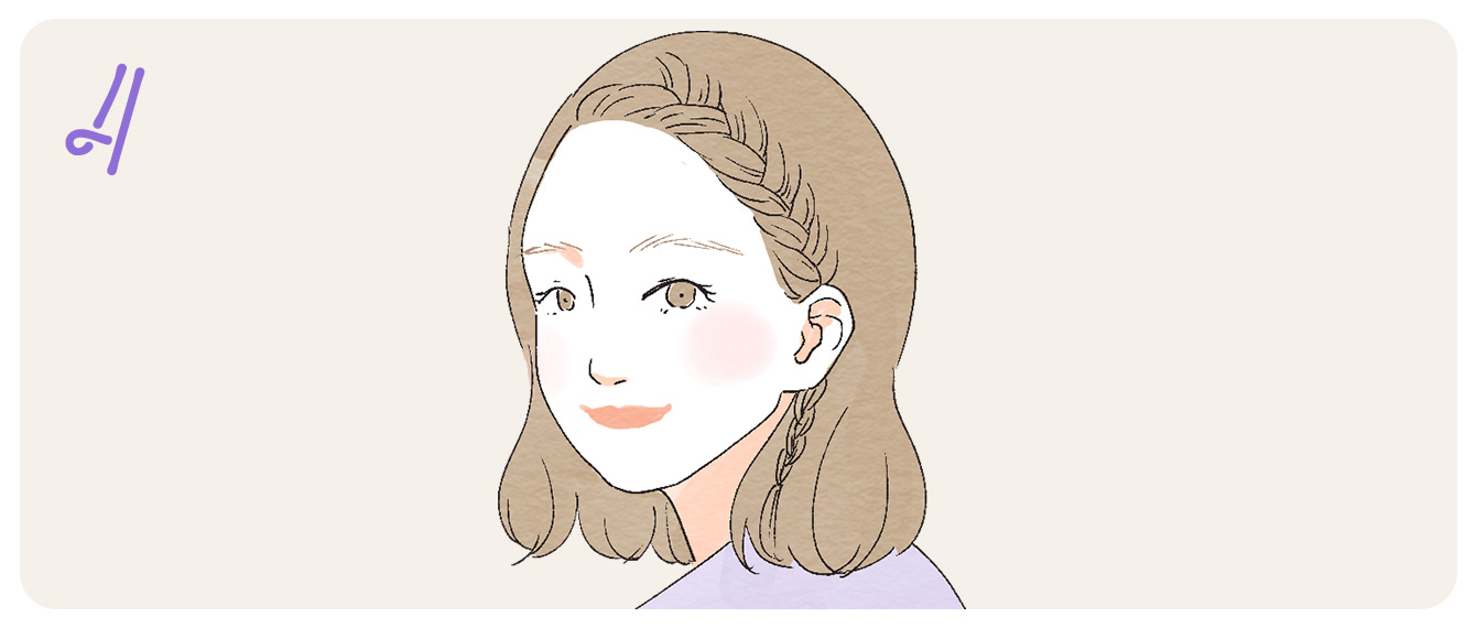 トップにある程度の長さがあれば、編み込むことができるため、髪が短い方でも楽しむことができます。