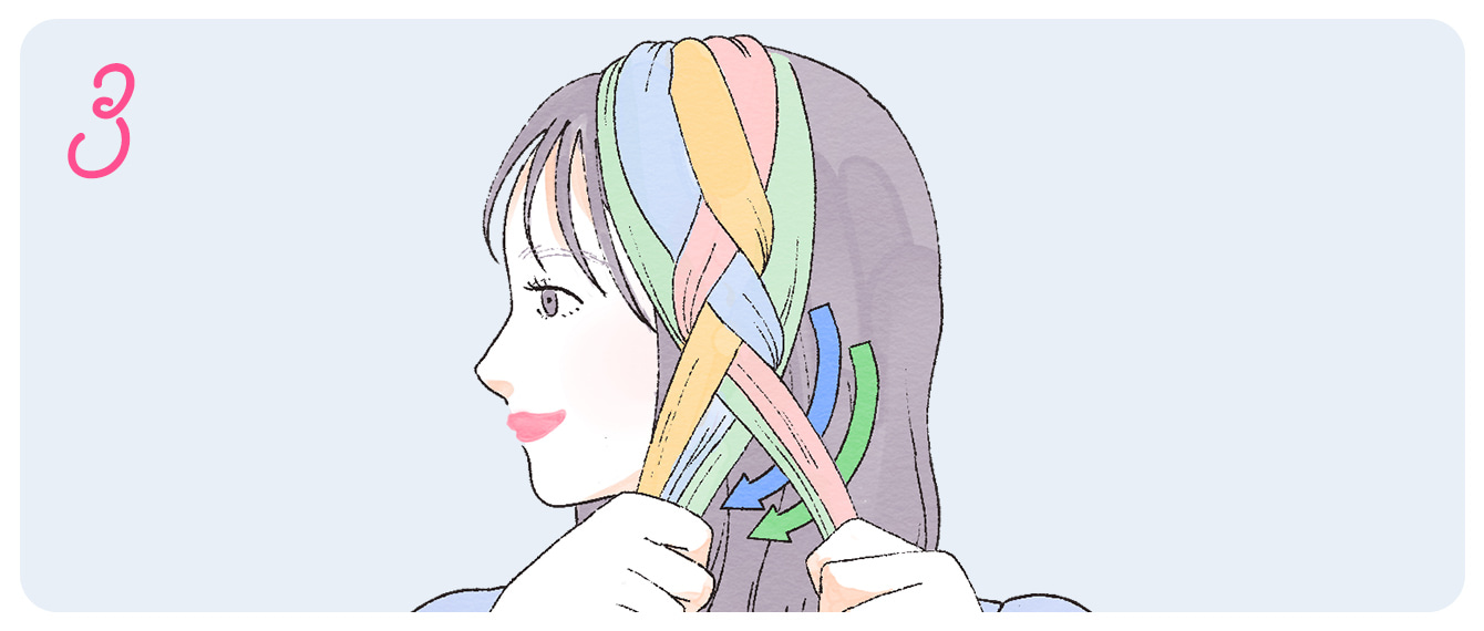 3本の毛束を編むのは表編みと同じですが、毛束を交差させる際に、左右の毛束を中央の毛束の下に重ねて編んでいきます。